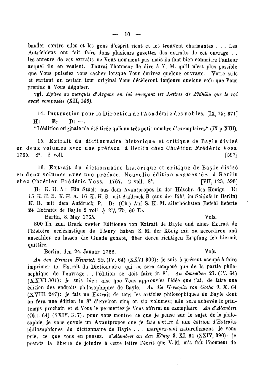 An den Prinzen Heinrich 22. (IV. 64) (XXVI 300) : je suis à présent occupé à faire imprimer un Extrait du Dictionnaire qui ne sera composé que de la partie philosophique de l'ouvrage ... l'édition se doit faire in 8°. An denselben 27. (IV. 64) (XXVI 301) : je suis bien aise que Vous approuviez l'idée que j'ai, de faire une édition des endroits philosophiques de Bayle. An die Herzogin von Gotha 9. X. 64 (XVIII, 247) : je fais un Extrait de tous les articles philosophiques de Bayle dont on fera une édition in 8° d'environ cinq ou six volumes; elle sera achevée le printemps prochain et si Vous le permettez je Vous offrirai un exemplaire. An d'Alembert (Okt. 64) (XXIV, 3*7) : pour vous montrer ce que je pense sur le sujet de la philosophie, je vous envoie un Avantpropos que je fais mettre à une édition d'Extraits philosophiques du dictionnaire de Bayle ... marquez-moi naturellement, je vous prie, ce que vous en pensez. d'Alembert an den König 3. XI. 64 (XXIV, 390) : je prends la liberté de joindre à cette lettre l'écrit que V. M. m'a fait l'honneur de