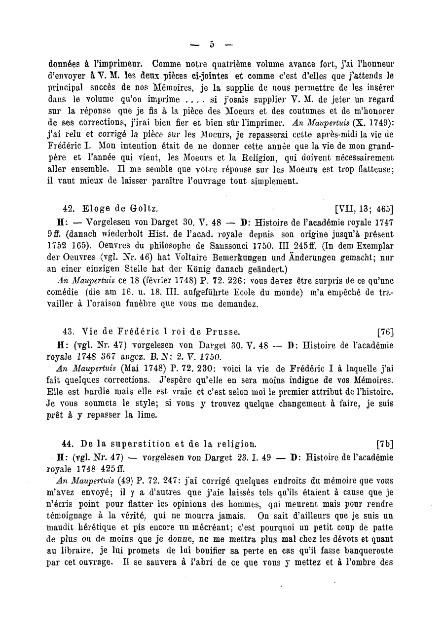 <5> données à l'imprimeur. Comme notre quatrième volume avance fort, j'ai l'honneur d'envoyer à V. M. les deux pièces ci-jointes et comme c'est d'elles que j'attends le principal succès de nos Mémoires, je la supplie de nous permettre de les insérer dans le volume qu'on imprime .... si j'osais supplier V. M. de jeter un regard sur la réponse que je fis à la pièce des Moeurs et des coutumes et de m'honorer de ses corrections, j'irai bien fier et bien sûr l'imprimer. An Maupertuis (X. 1749) : j'ai relu et corrigé la pièce sur les Moeurs, je repasserai cette après-midi la vie de Frédéric I. Mon intention était de ne donner cette année que la vie de mon grand-père et l'année qui vient, les Moeurs et la Religion, qui doivent nécessairement aller ensemble. Il me semble que votre répouse sur les Moeurs est trop flatteuse; il vaut mieux de laisser paraître l'ouvrage tout simplement.