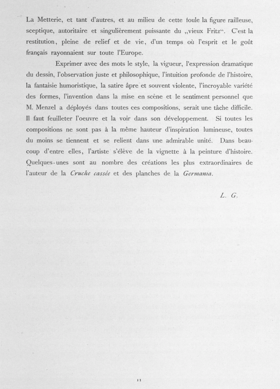 Exprimer avec des mots le style, la vigueur, l'expression dramatique du dessin, l'observation juste et philosophique, l'intuition profonde de l'histoire, la fantaisie humoristique, la satire âpre et souvent violente, l'incroyable variété des formes, l'invention dans la mise en scène et le sentiment personnel que M. Menzel a déployés dans toutes ces compositions, serait une tâche difficile. Il faut feuilleter l'oeuvre et la voir dans son développement. Si toutes les compositions ne sont pas à la même hauteur d'inspiration lumineuse, toutes du moins se tiennent et se relient dans une admirable unité. Dans beaucoup d'entre elles, l'artiste s'élève de la vignette à la peinture d'histoire. Quelques-unes sont au nombre des créations les plus extraordinaires de l'auteur de la Cruche cassée et des planches de la Germania.