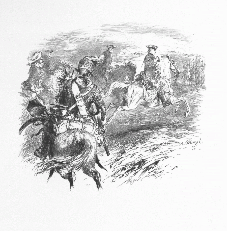 31. Le roi Frédéric II, galopant sur son cheval blanc, à la tête de son escorte. (Chap. VI de l'„Histoire de la guerre de Sept ans“. - Gravure d'O. Vogel.)