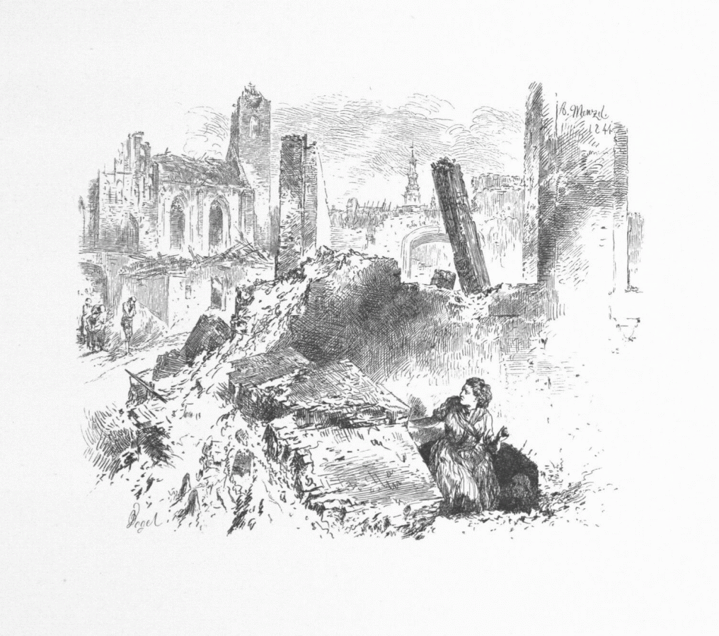 42. Ruines d'une ville incendiée par le bombardement. (Chap. XVI de l'Histoire de la guerre de Sept ans“. - Gravure d'O. Vogel.)