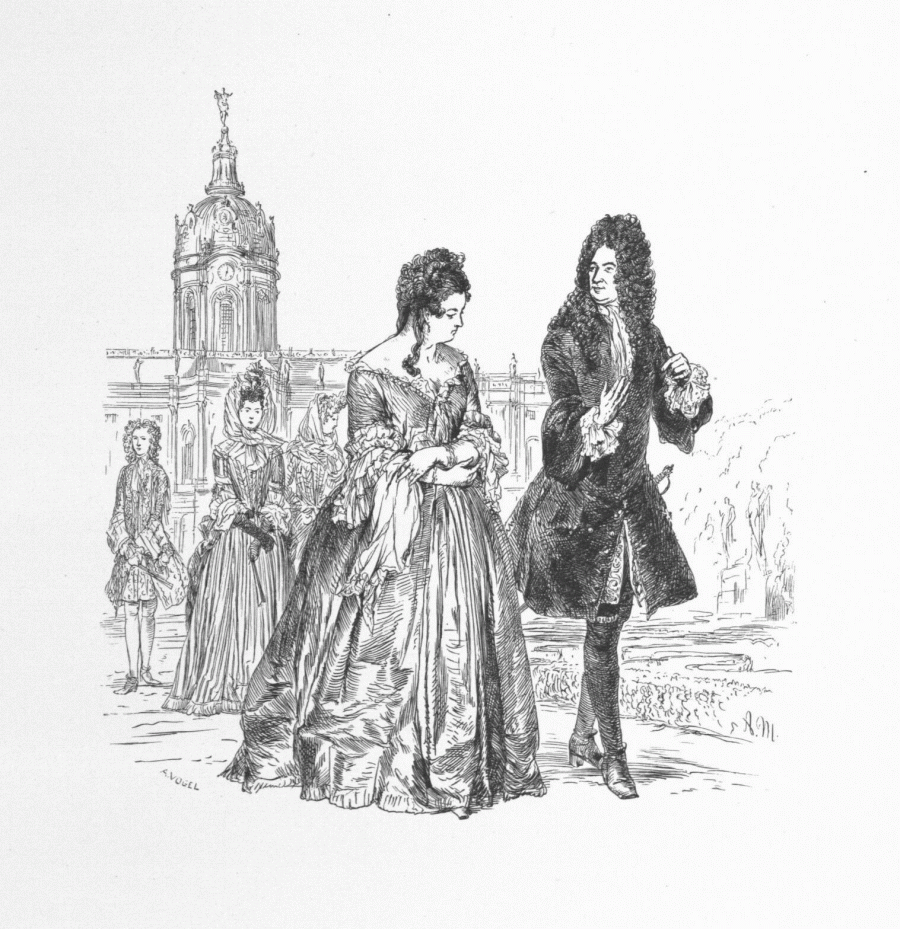 5. La reine Sophie-Charlotte se promenant devant Charlottenbourg, en conversant avec Leibnitz. (Chapt. VII des „Mémoires de Brandebourg“. - Gravure d'A. Vogel.)