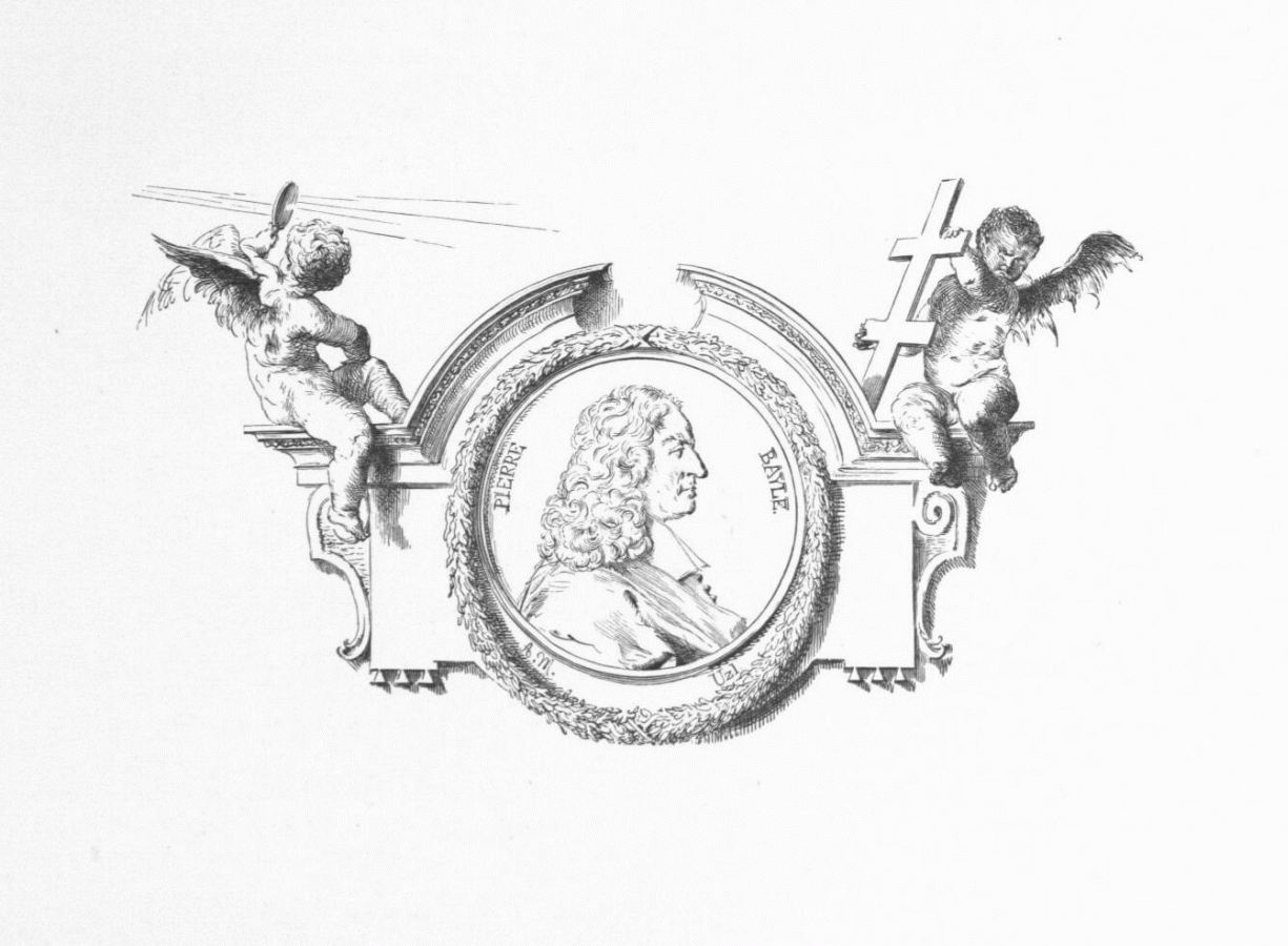 Rundes Reliefbildnis des Philosophen Pierre Bayle vor Barockkonsole, auf der ein Putto mit einem Brennglas Lichtstrahlen auffängt und ein anderer sich im Schatten eines Doppelkreuzes zu verbergen sucht.