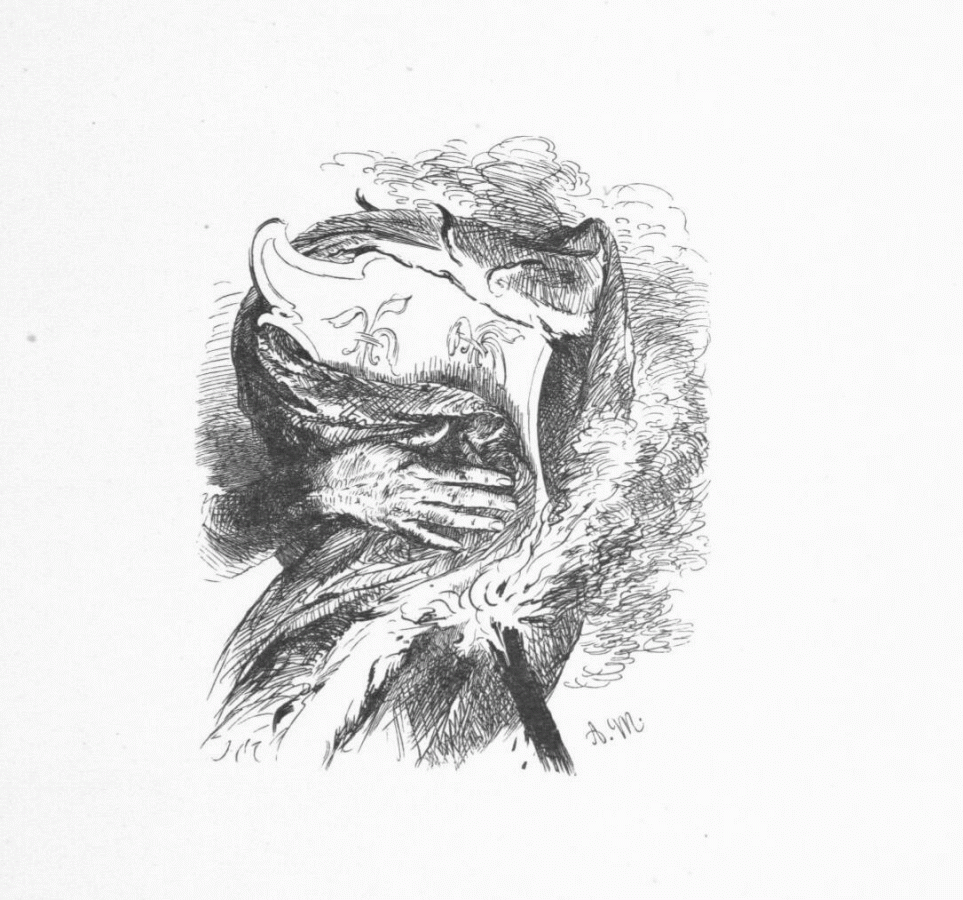 Eine Hand sucht das französische Lilienwappen mit einem Hermelinmantel gegen das drohende Feuer einer Fackel zu schützen.