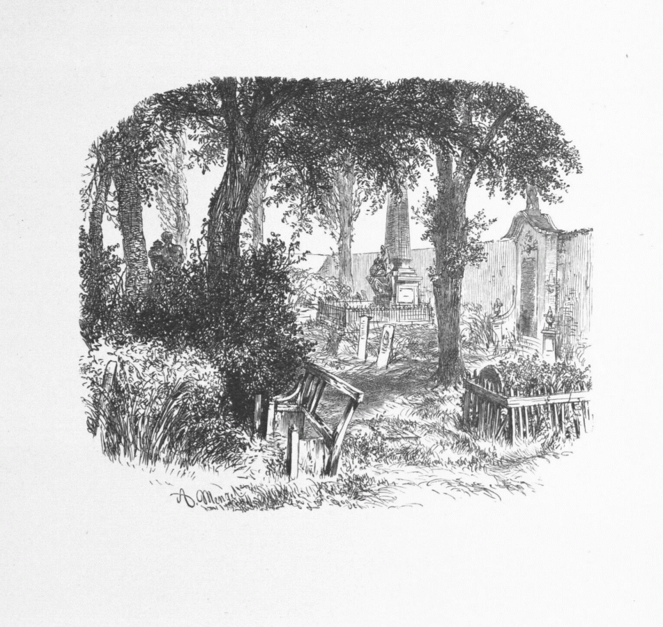 Ein alter, schattiger Friedhof. Rechts an der Mauer ansehnliche Grabmäler, vorne links eine verfallene Bank vor einem verwahrlosten überwucherten Grabe.