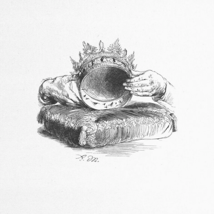 Eine von zwei Händen auf einem Kissen gehaltene Krone, die innen Stacheln hat.