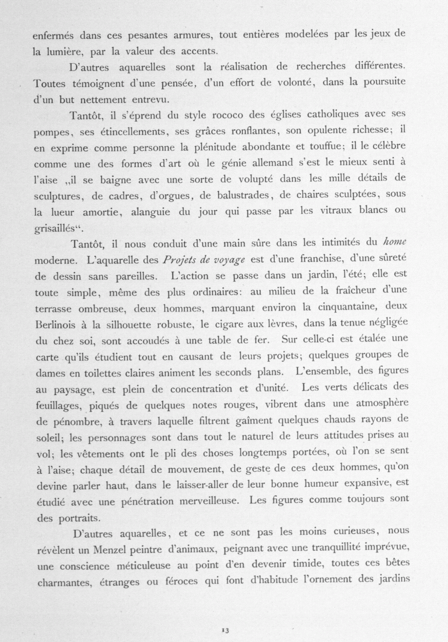 D'autres aquarelles, et ce ne sont pas les moins curieuses, nous révèlent un Menzel peintre d'animaux, peignant avec une tranquillité imprévue, une conscience méticuleuse au point d'en devenir timide, toutes ces bêtes charmantes, étranges ou féroces qui font d'habitude l'ornement des jardins