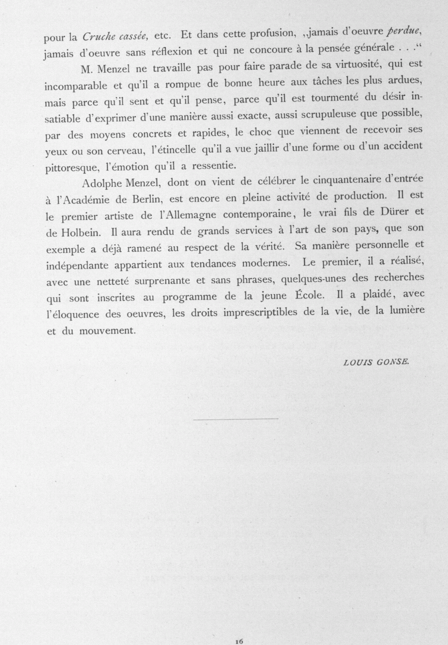 Adolphe Menzel, dont on vient de célébrer le cinquantenaire d'entrée à l'Académie de Berlin, est encore en pleine activité de production. Il est le premier artiste de l'Allemagne contemporaine, le vrai fils de Durer et de Holbein. Il aura rendu de grands services à l'art de son pays, que son exemple a déjà ramené au respect de la vérité. Sa manière personnelle et indépendante appartient aux tendances modernes. Le premier, il a réalisé, avec une netteté surprenante et sans phrases, quelques-unes des recherches qui sont inscrites au programme de la jeune École. Il a plaidé, avec l'éloquence des oeuvres, les droits imprescriptibles de la vie, de la lumière et du mouvement.