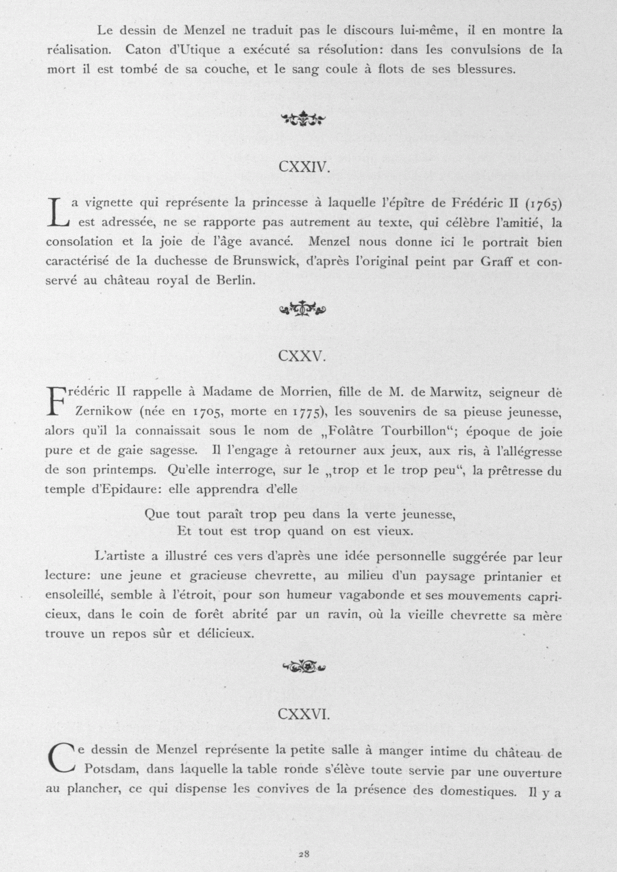 La vignette qui représente la princesse à laquelle l'épître de Frédéric II (1765) est adressée, ne se rapporte pas autrement au texte, qui célèbre l'amitié, la consolation et la joie de l'âge avancé. Menzel nous donne ici le portrait bien caractérisé de la duchesse de Brunswick, d'après l'original peint par Graff et conservé au château royal de Berlin.