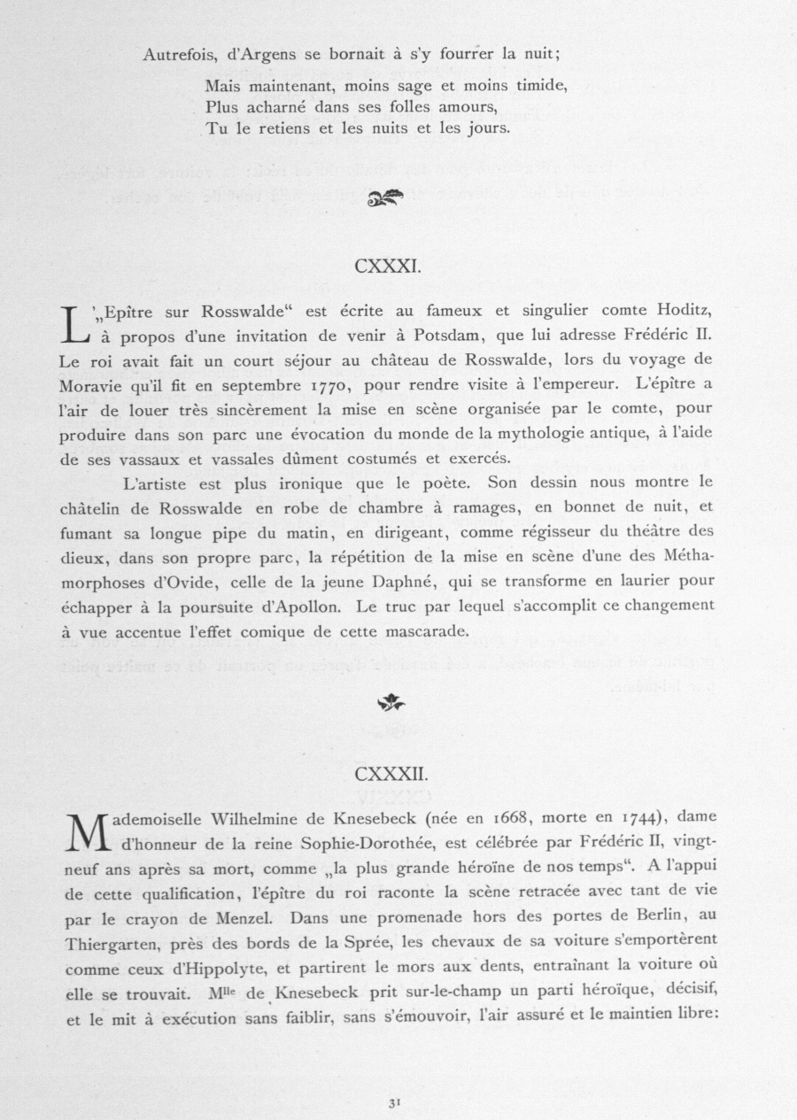 L'artiste est plus ironique que le poète. Son dessin nous montre le châtelin de Rosswalde en robe de chambre à ramages, en bonnet de nuit, et fumant sa longue pipe du matin, en dirigeant, comme régisseur du théâtre des dieux, dans son propre parc, la répétition de la mise en scène d'une des Méthamorphoses d'Ovide, celle de la jeune Daphné, qui se transforme en laurier pour échapper à la poursuite d'Apollon. Le truc par lequel s'accomplit ce changement à vue accentue l'effet comique de cette mascarade.