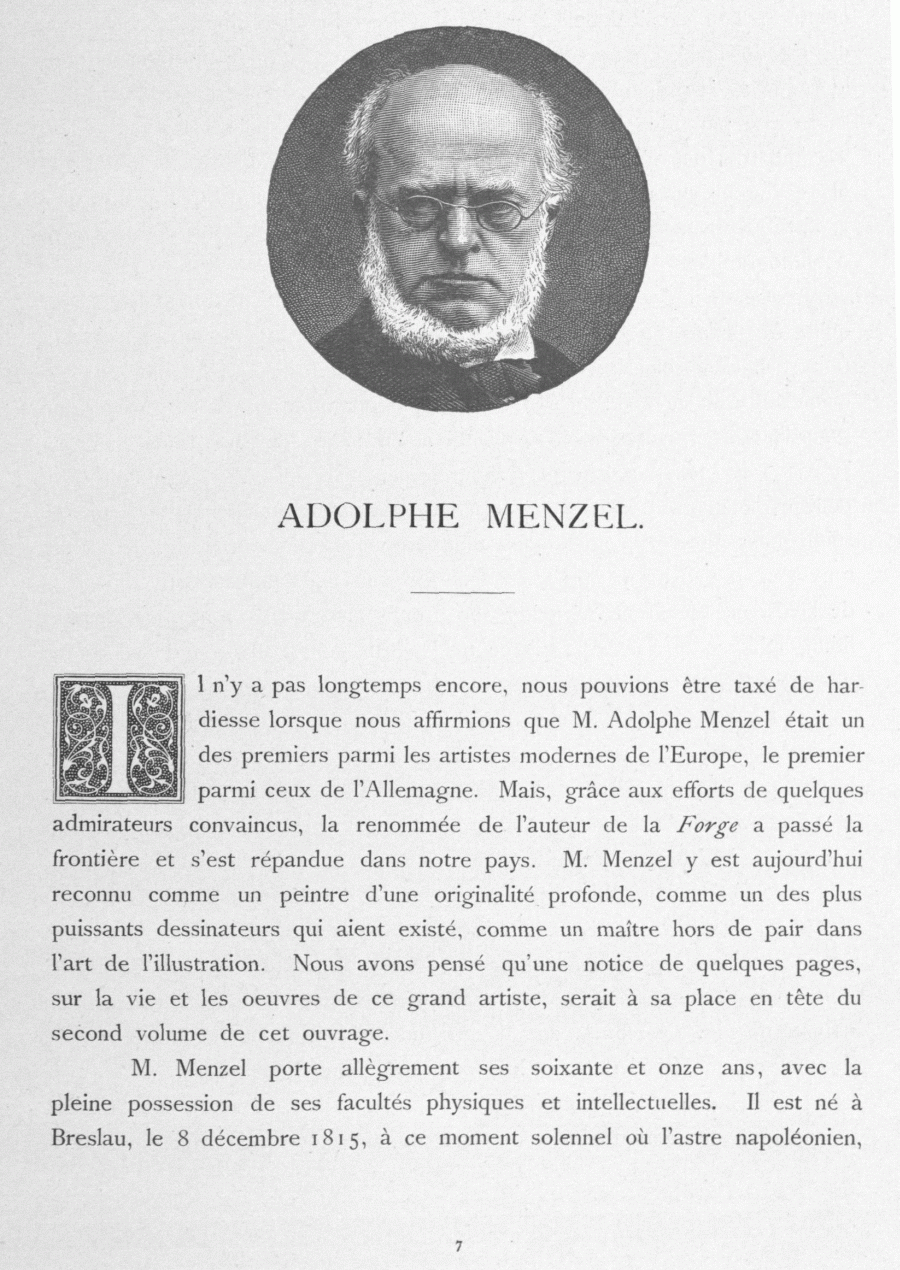 Il n'y a pas longtemps encore, nous pouvions être taxé de hardiesse lorsque nous affirmions que M. Adolphe Menzel était un des premiers parmi les artistes modernes de l'Europe, le premier parmi ceux de l'Allemagne. Mais, grâce aux efforts de quelques admirateurs convaincus, la renommée de l'auteur de la Forge a passé la frontière et s'est répandue dans notre pays. M. Menzel y est aujourd'hui reconnu comme un peintre d'une originalité profonde, comme un des plus puissants dessinateurs qui aient existé, comme un maître hors de pair dans l'art de l'illustration. Nous avons pensé qu'une notice de quelques pages, sur la vie et les oeuvres de ce grand artiste, serait à sa place en tête du second volume de cet ouvrage.