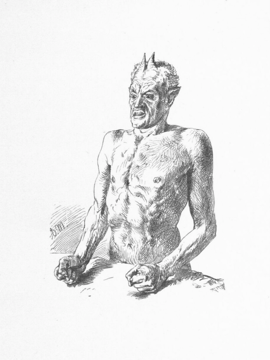 Die nackte Halbfigur eines gehörnten Dämons mit geballten Fäusten.