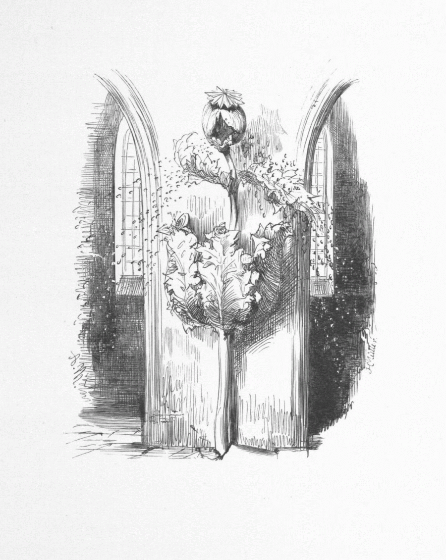 An einem Mauerpfeiler im Inneren einer Kirche steht eine wie eine Kanzel mit Prediger geformte Mohnpflanze, aus deren aufgesprungener Kapsel sich Mohnkörner ergießen.