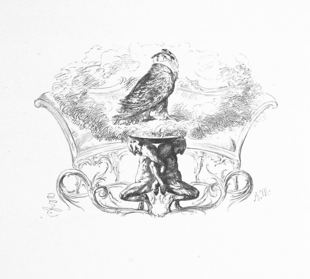 Eine große Eule in gravitätischer Haltung auf einem Sofa stehend, läßt sich von Weihrauchwolken umspielen, die aus einer von zwei Satyrn getragenen Schale zu ihr aufsteigen.