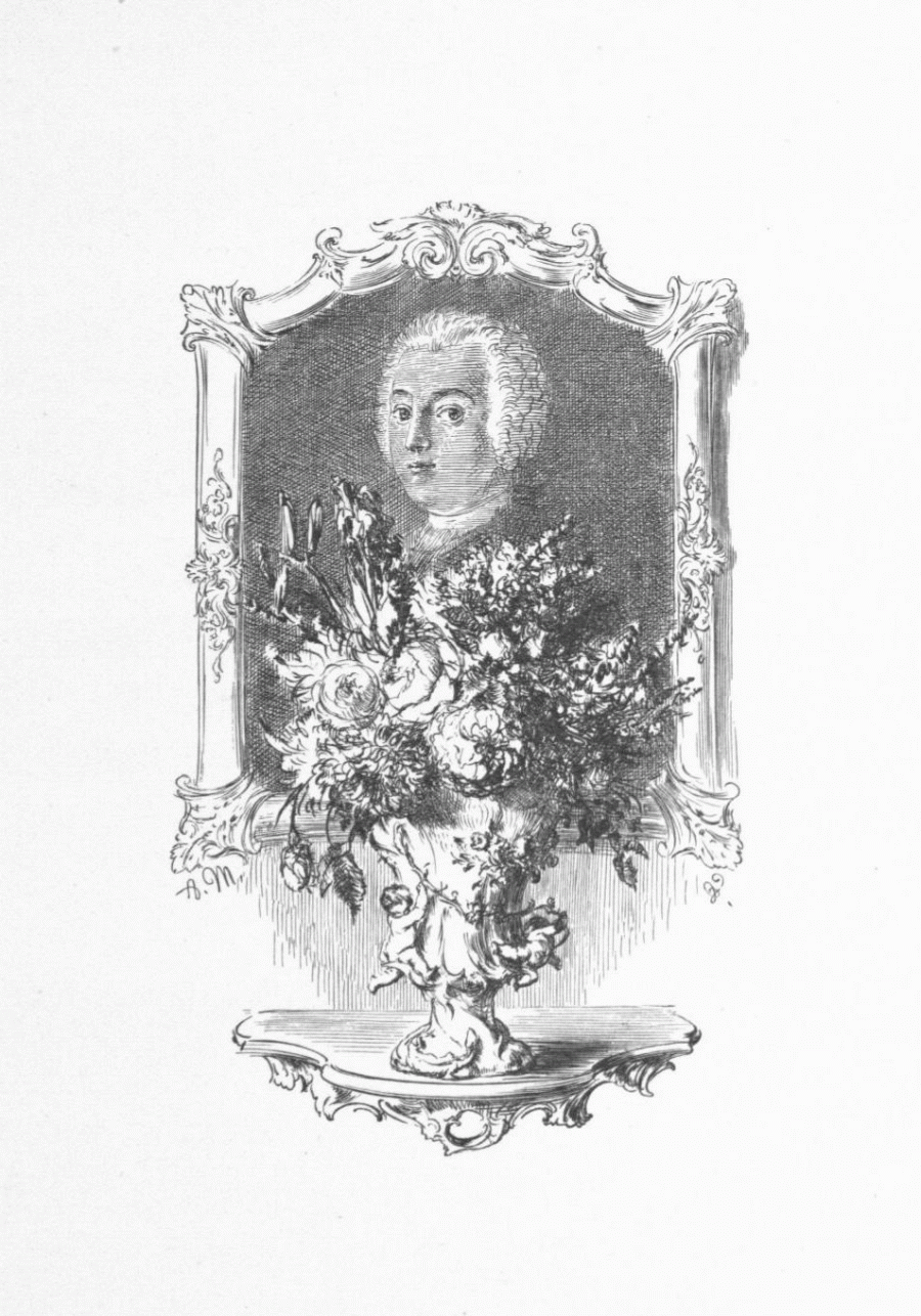 Pesnes eingerahmtes Bildnis des Kronprinzen aus dem Jahr 1739 hinter einem großen Blumenstrauß in einer Rokokovase.