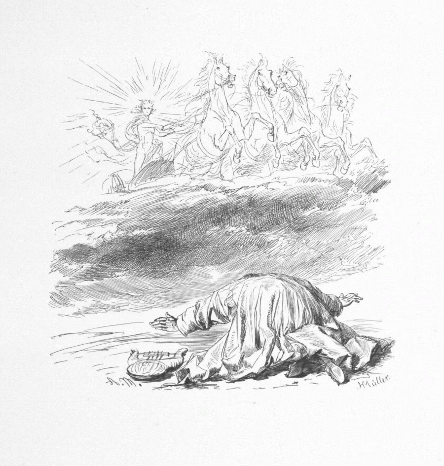 169. Le poète prosterné devant Apollon. („Correspondance de Frédéric avec Voltaire“. - Gravure de Müller.)