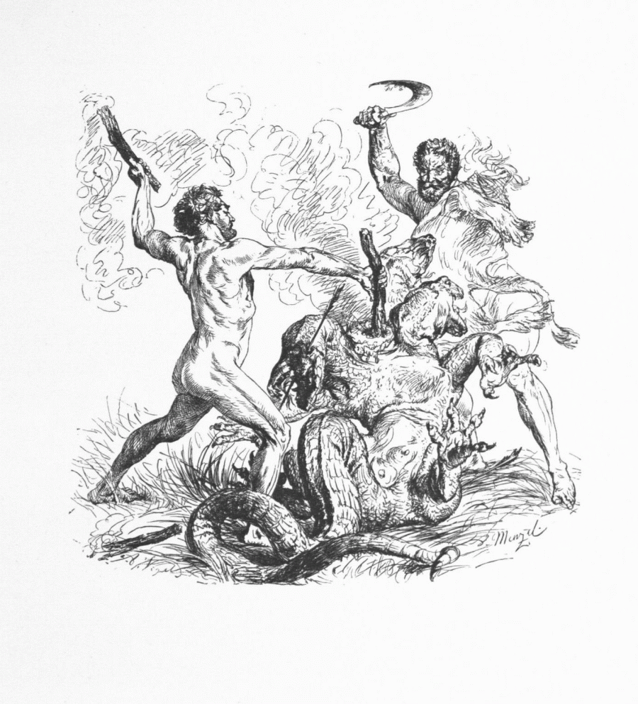 177. Hercule et Iolas combattant l'Hydre de Lerne. („Correspondance de Frédéric avec le prince Henri de Prusse“. - Gravure d'A. Vogel.)