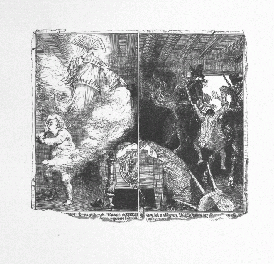 Zweigeteilte Darstellung, auf deren rechter Hälfte Darget, der mit Valory das Bett getauscht hat, von Panduren geraubt wird; links erscheint Genoveva dem marquis de Valory, der im Adamskostüm aus dem Bett gesprungen ist.