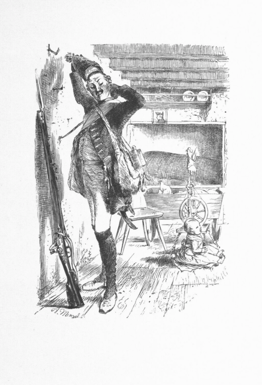 Ein Grenadier, im Quartier, setzt müde seine Mütze ab. Sein Gewehr lehnt links an der Wand. Über der Bettstatt im Hintergrund ein Porträt Friedrichs des Großen.