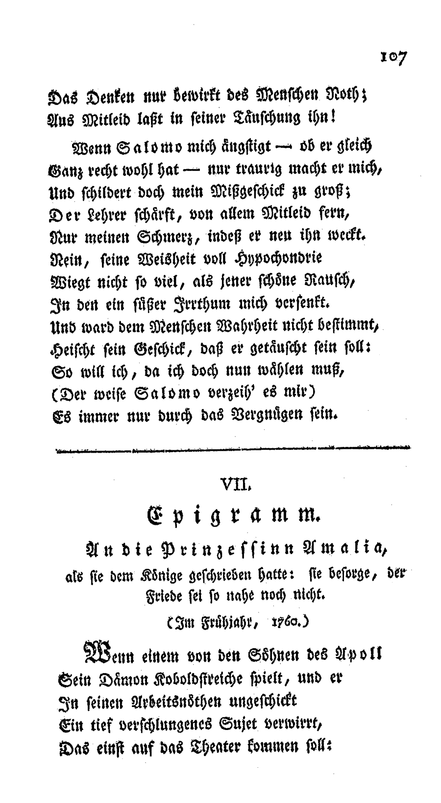 Epigramm an die Prinzessin Amalia, als sie dem Könige geschrieben hatte, sie besorge, der Friede sei so nahe nicht (im Frühjahr 1760)