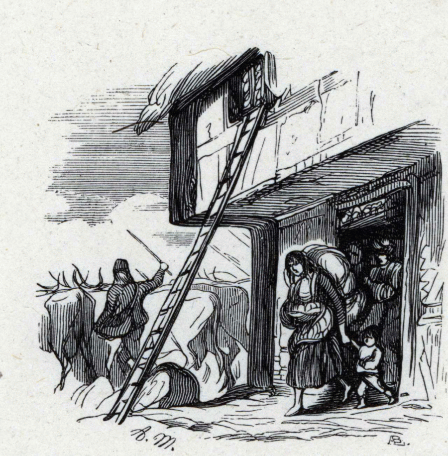 Anfangsbuchstabe S, der Form eines Hauses folgend, das von seinen Bewohnern verlassen wird