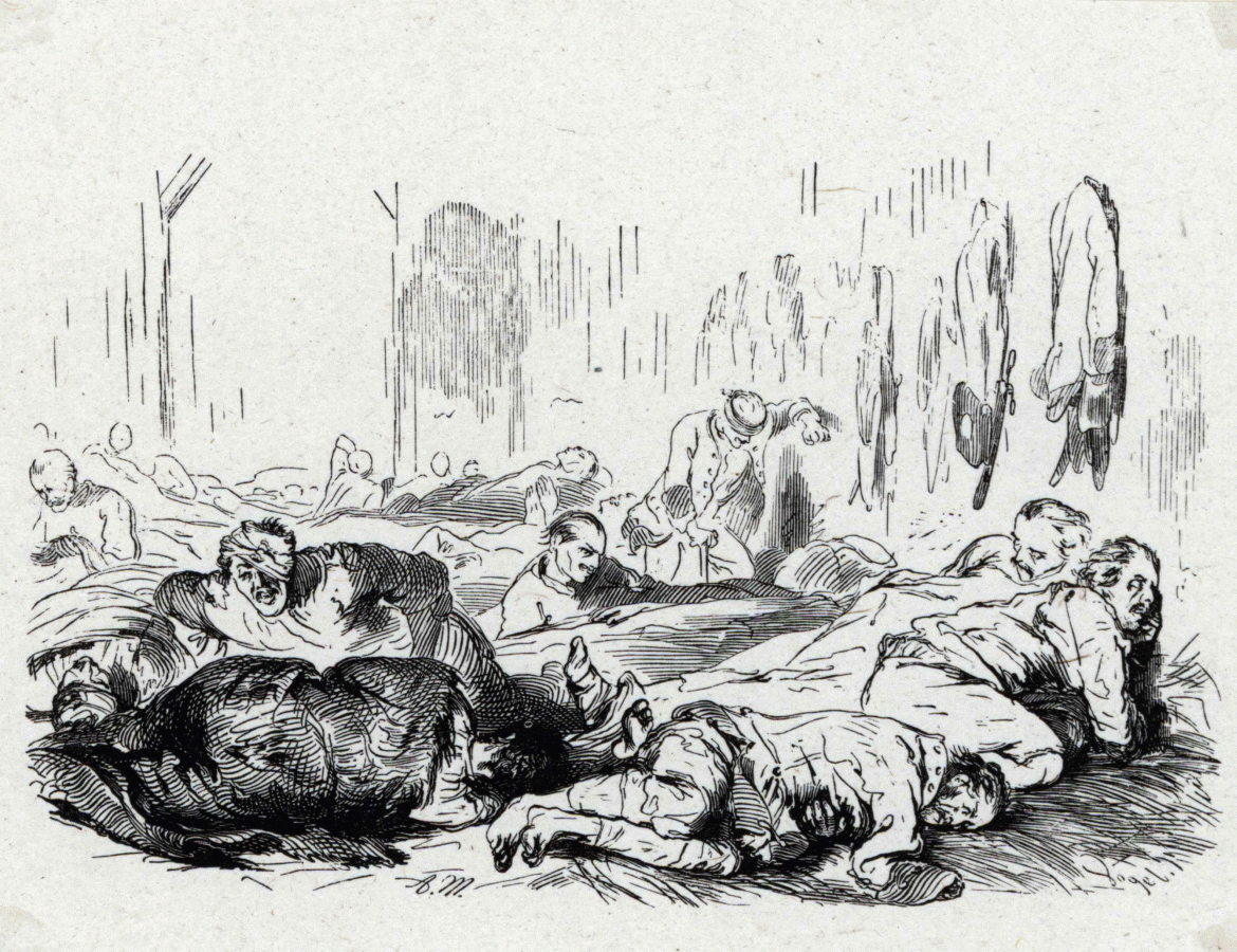 In Prag eingeschlossene, meist verwundete Österreicher auf dem Stroh liegend