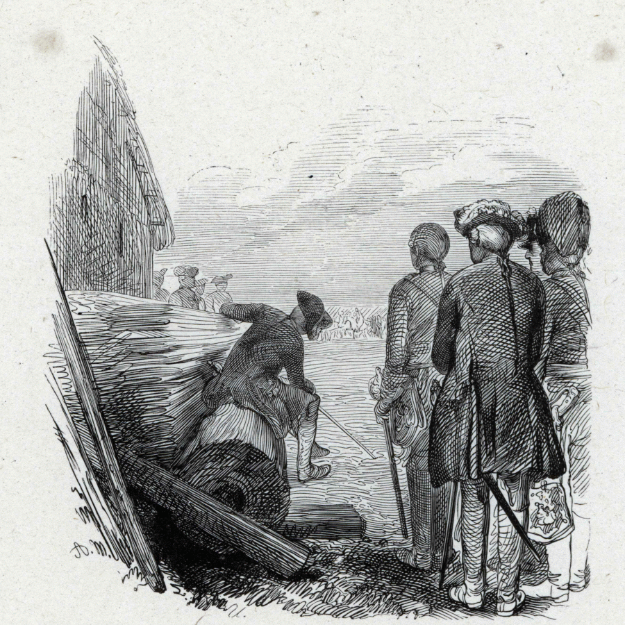Friedrich sitzt nach der verlorenen Schlacht von Kollin entmutigt auf einer Brunnenröhre. Rechts vorn eine Gruppe von Offizieren