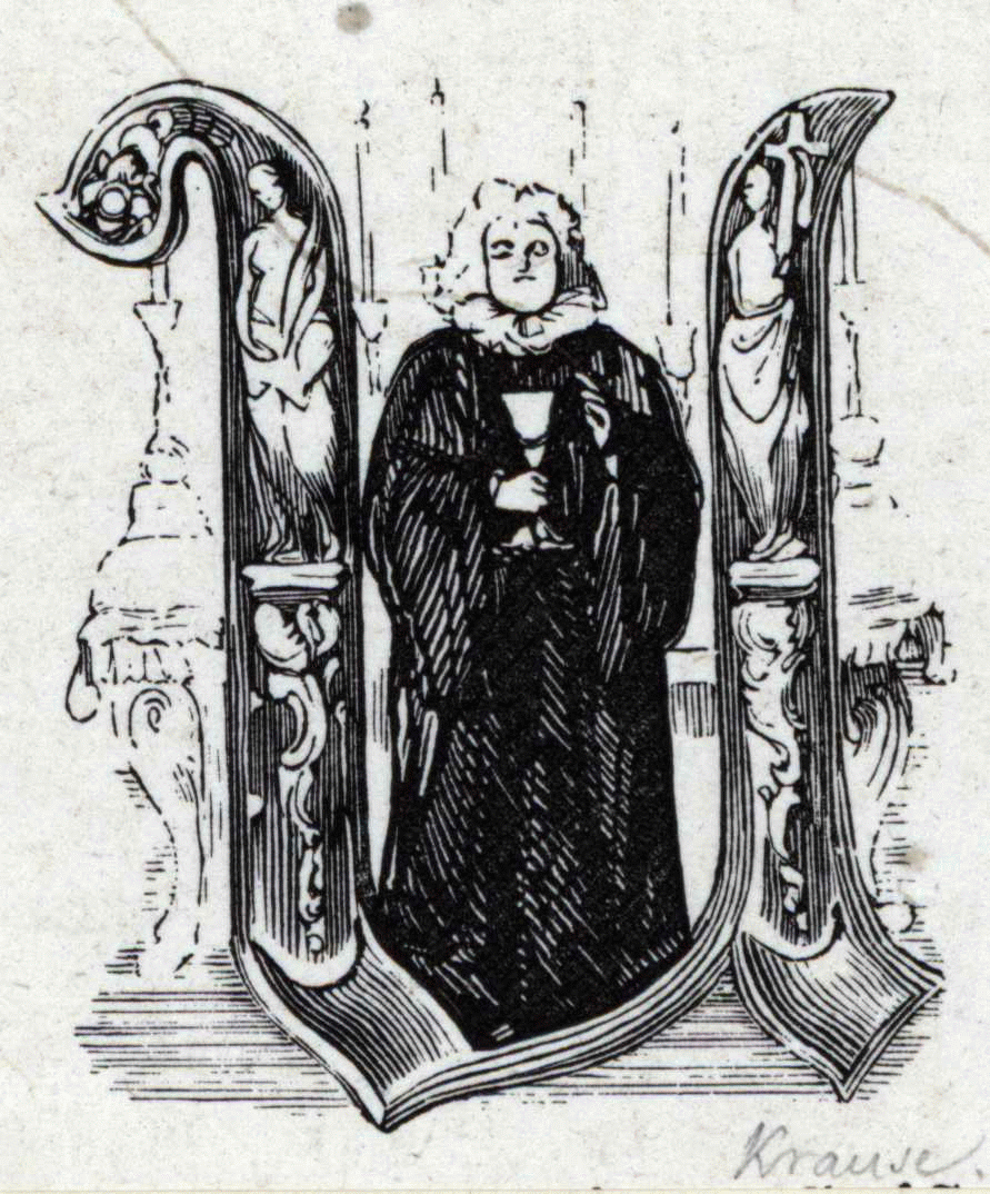 Anfangsbuchstabe U mit einem Geistlichen vor dem Altar