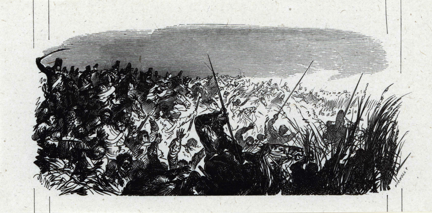 Kosaken werden von preußischen Husaren nach rechts ins Schilf gejagt (Zorndorf)