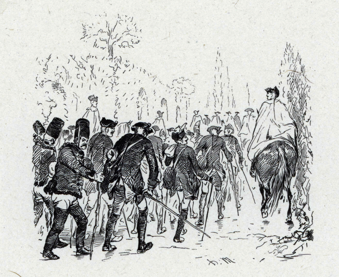 Die bei Maxen kriegsgefangenen Preußen werden durch den Großen Garten in Dresden geführt. Sie ziehen nach rechts dem Hintergrunde zu