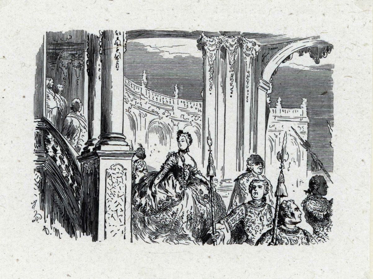 Die marquise von Pompadour schreitet durch eine Säulenhalle nach rechts herab