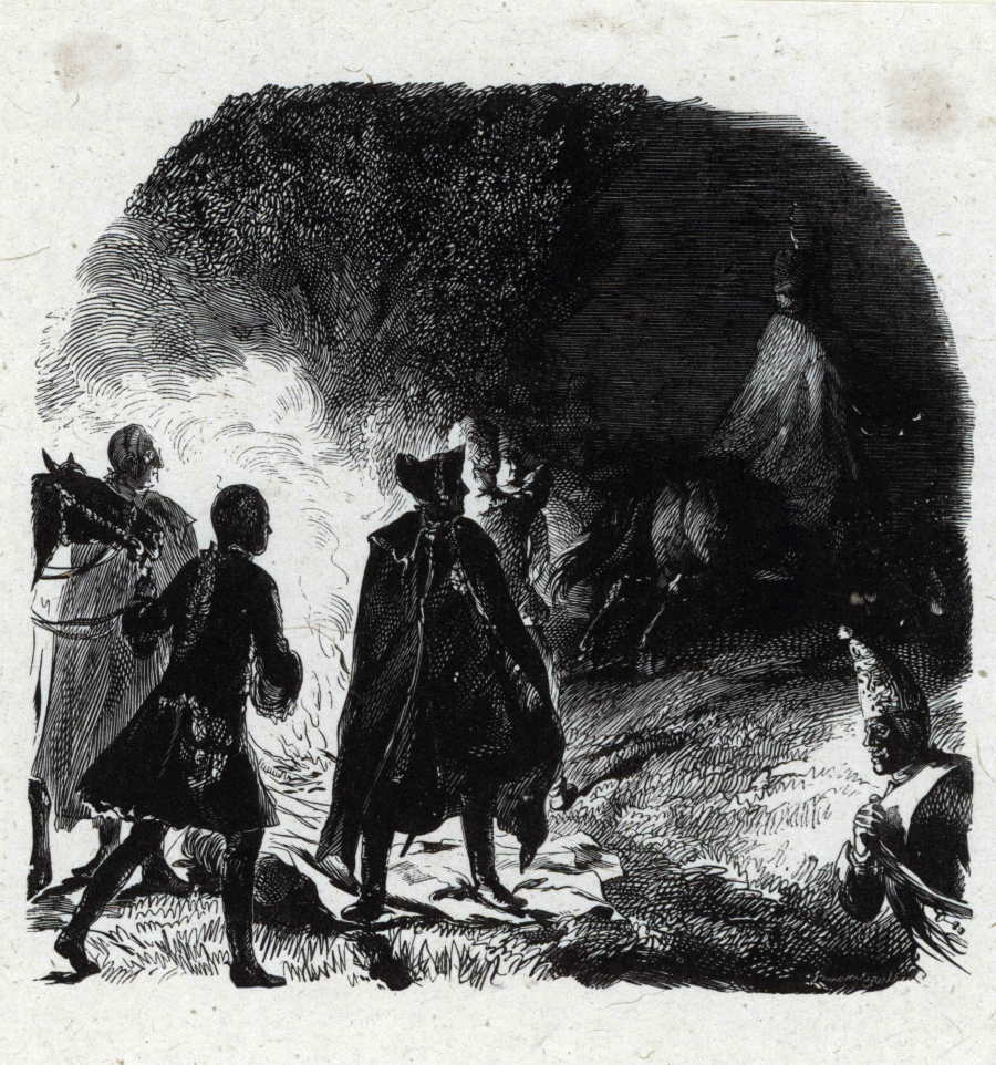 Friedrich, vor dem Wachtfeuer stehend, erhält die Meldung vom Herannahen des Feindes. Husarenmajor Hundt, der die Nachricht gebracht, reitet nach rechts fort. Links, im Profil, Markgraf von Brandenburg-Schwedt