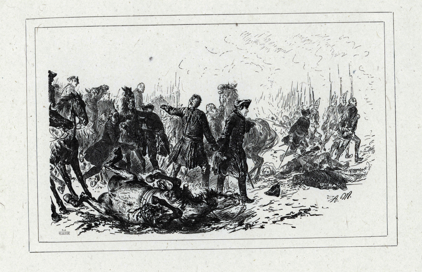 Friedrich im Gewühl der Schlacht von Torgau. Sein Pferd ist erschossen; er schreitet Befehle erteilend nach rechts