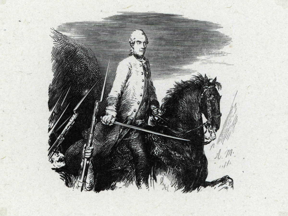 Laudon reitet barhäuptig mit gezogenem Degen nach rechts