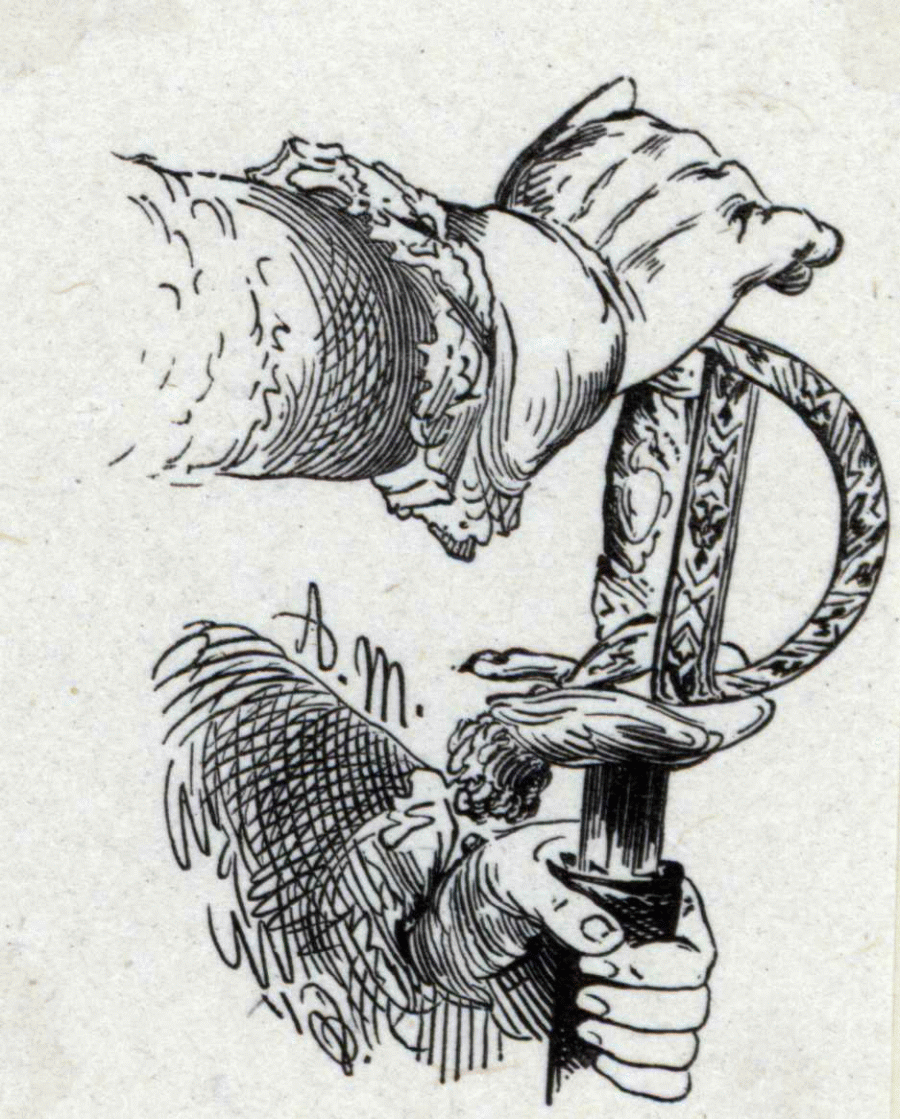 Anfangsbuchstabe D, am Griffe eines Degens, der von einer behandschuhten Hand in die Scheide gestoßen wird