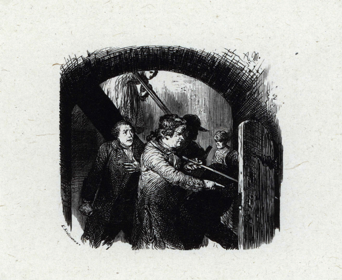 Zollrevision im Keller. Der Beamte weist nach rechts auf eine Tür