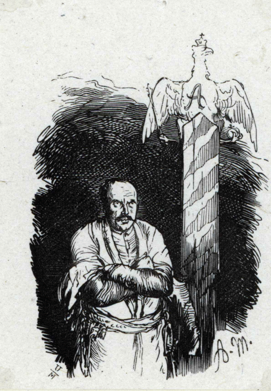 Anfangsbuchstabe A auf einem polnischen Grenzpfahl, neben dem links ein barhäuptiger Pole steht