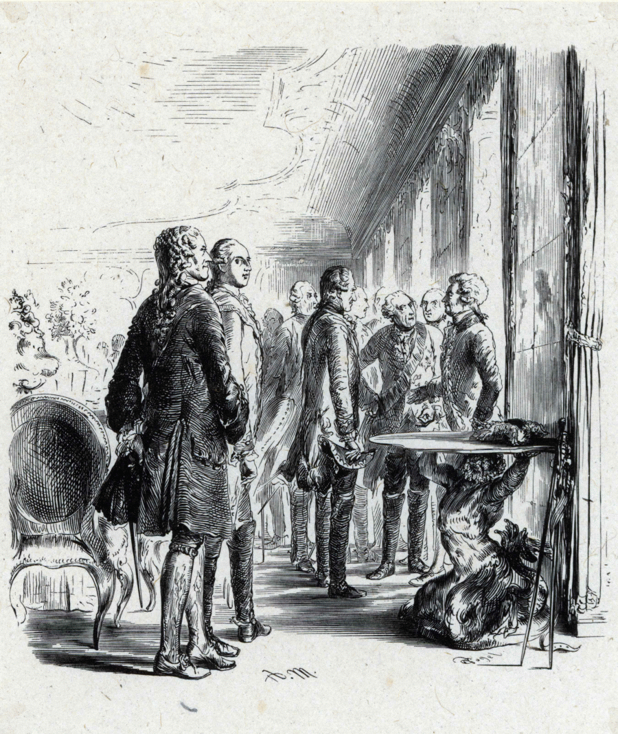 Friedrich als Gast Josephs II. im Wiener Schlosse. Rechts Friedrich zwischen Laudon und Ligne; von links nähern sich Joseph und Kaunitz