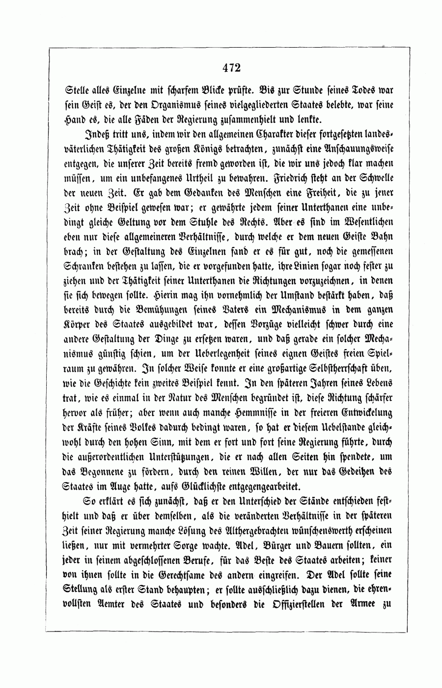 Indes tritt uns, wenn wir den allgemeinen Charakter dieser fortgesetzten landesväterlichen Tätigkeit des großen Königs betrachten, zunächst eine Anschauungsweise entgegen, die unsrer Zeit bereits fremd geworden ist, die wir uns jedoch klarmachen müssen, um ein unbefangenes Urteil zu bewahren. Friedrich steht an der Schwelle der neuen Zeit. Er gab dem Gedanken des Menschen eine Freiheit, die bis dahin ohne Beispiel gewesen war; er gewährte jedem seiner Untertanen eine unbedingt gleiche Geltung vor dem Stuhle des Rechts. Aber es sind im wesentlichen eben nur diese allgemeineren Verhältnisse, durch welche er dem neuen Geiste Bahn brach; in der Gestaltung des einzelnen fand er es für gut, noch die gemessenen Schranken bestehen zu lassen, die er vorgefunden hatte, ihre Linien sogar noch fester zu ziehen, und der Tätigkeit seiner Untertanen die Richtungen vorzuzeichnen, in denen sie sich bewegen sollte. Hierin mag ihn vornehmlich der Umstand bestärkt haben, daß bereits durch die Bemühungen seines Vaters ein Mechanismus in dem ganzen Körper des Staates ausgebildet war, dessen Vorzüge vielleicht schwer durch eine andere Gestaltung der Dinge zu ersetzen waren, und daß gerade ein solcher Mechanismus günstig schien, um der Überlegenheit seines eignen Geistes freien Spielraum zu gewähren. In solcher Weise konnte er eine großartige Selbstherrschaft üben, wie die Geschichte kein zweites Beispiel kennt. In den späteren Jahren seines Lebens trat, wie es einmal in der Natur des Menschen begründet ist, diese Richtung schärfer hervor als früher; aber wenn auch manche Hindernisse in der freieren Entwickelung der Kräfte seines Volkes dadurch bedingt waren, so hat er diesem Übelstande gleichwohl durch den hohen Sinn, mit dem er fort und fort seine Regierung führte, durch die außerordentlichen Unterstützungen, die er nach allen Seiten hin spendete, um das Begonnene zu fördern, durch den reinen Willen, der nur das Gedeihen des Staates im Auge hatte, aufs glücklichste entgegengearbeitet.
