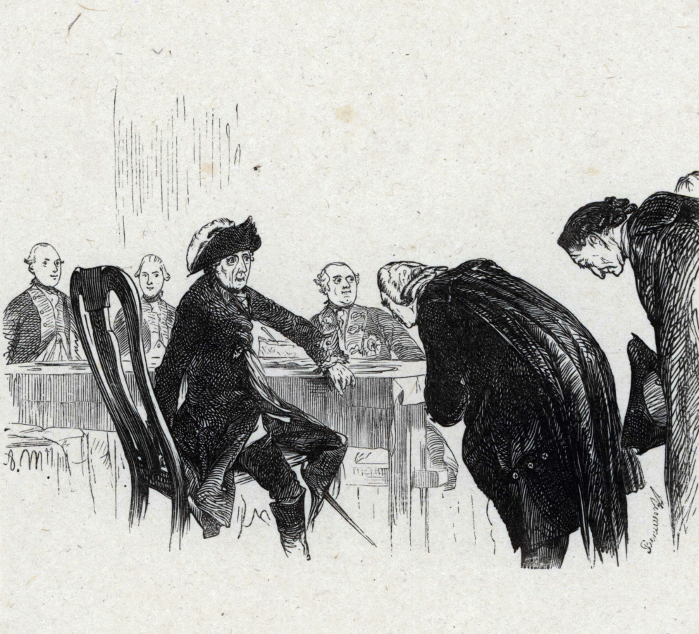 Friedrich, der mit dem Thronfolger und zwei Adjutanten links an der Tafel sitzt, empfängt eine Deputation der schlesischen Stadt Greiffenberg