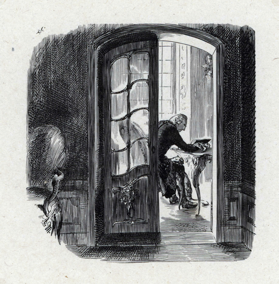 Durch eine halbgeöffnete Glastür sieht man den König nach rechts gewandt, lesend am Arbeitstisch sitzen