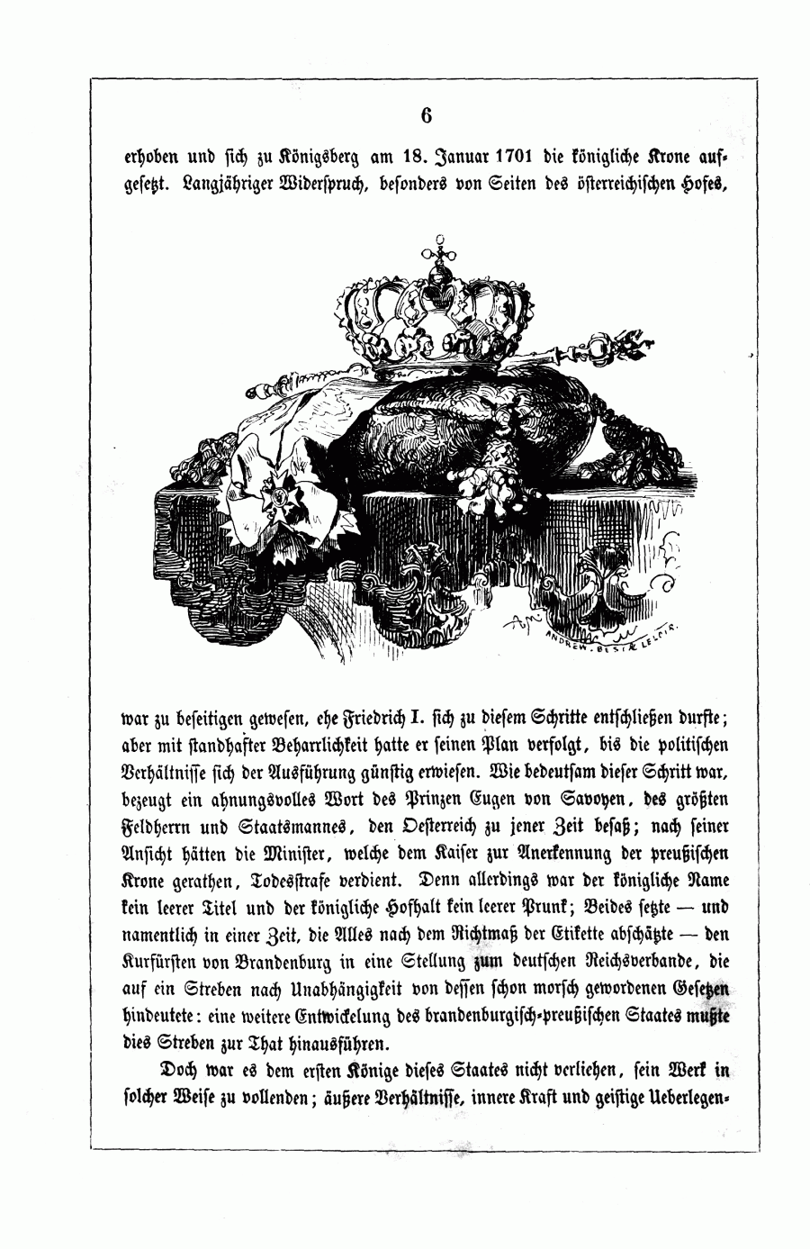 <6>erhoben und sich zu Königsberg, am 18. Januar 1701, die königliche Krone aufgesetzt. Langjähriger Widerspruch, besonders von Seiten des österreichischen Hofes, war zu beseitigen gewesen, ehe Friedrich I. sich zu diesem Schritte entschließen durfte; aber mit standhafter Beharrlichkeit hatte er seinen Plan verfolgt, bis die politischen Verhältnisse sich der Ausführung günstig erwiesen. Wie bedeutsam dieser Schritt war, bezeugt ein ahnungsvolles Wort des Prinzen Eugen von Savoyen, des größten Feldherrn und Staatsmannes, den Österreich zu jener Zeit besaß; nach seiner Ansicht hätten die Minister, welche dem Kaiser zur Anerkennung der preußischen Krone geraten, Todesstrafe verdient. Denn allerdings war der königliche Name kein leerer Titel und der königliche Hofhalt kein leerer Prunk; beides setzte — und namentlich in einer Zeit, die alles nach dem Richtmaß der Etikette abschätzte — den Kurfürsten von Brandenburg in eine Stellung zum deutschen Reichsverbande, die auf ein Streben nach Unabhängigkeit von dessen schon morsch gewordenen Gesetzen hindeutete: eine weitere Entwicklung des brandenburgisch-preußischen Staates mußte dies Streben zur Tat hinausführen.