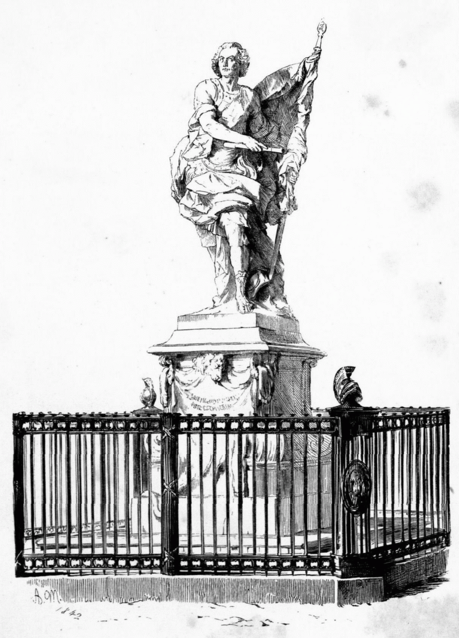 Kurd Christoph Graf von Schwerin. In römischer Feldherrntracht, den Kommandostab in der Rechten, eine Fahne in der Linken haltend