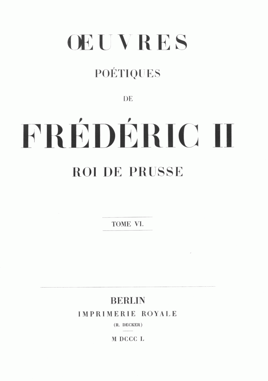 ŒUVRES POÉTIQUES DE FRÉDÉRIC II ROI DE PRUSSE TOME VI. BERLIN IMPRIMERIE ROYALE (R. DECKER) MDCCCL