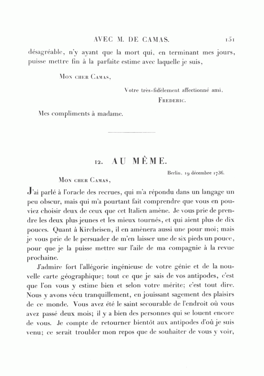 J'ai parlé à l'oracle des recrues, qui m'a répondu dans un langage un peu obscur, mais qui m'a pourtant fait comprendre que vous en pouviez choisir deux de ceux que cet Italien amène. Je vous prie de prendre les deux plus jeunes et les mieux tournés, et qui aient plus de dix pouces. Quant à Kircheisen, il en amènera aussi une pour moi; mais je vous prie de le persuader de m'en laisser une de six pieds un pouce, pour que je la puisse mettre sur l'aile de ma compagnie à la revue prochaine.
