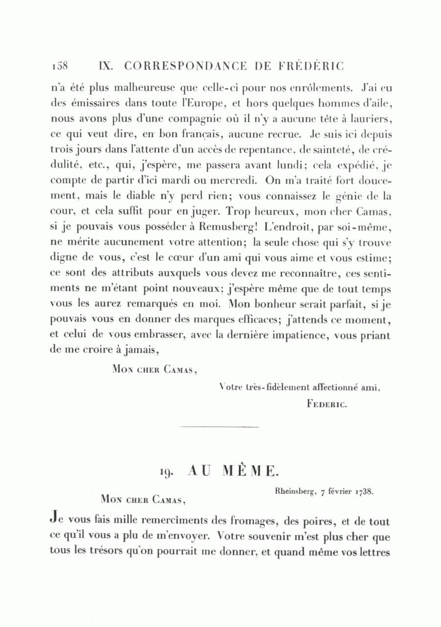 <158> n'a été plus malheureuse que celle-ci pour nos enrôlements. J'ai eu des émissaires dans toute l'Europe, et hors quelques hommes d'aile, nous avons plus d'une compagnie où il n'y a aucune tête à lauriers, ce qui veut dire, en bon français, aucune recrue. Je suis ici depuis trois jours dans l'attente d'un accès de repentance, de sainteté, de crédulité, etc., qui, j'espère, me passera avant lundi; cela expédié, je compte de partir d'ici mardi ou mercredi. On m'a traité fort doucement, mais le diable n'y perd rien; vous connaissez le génie de la cour, et cela suffit pour en juger. Trop heureux, mon cher Camas, si je pouvais vous posséder à Remusberg! L'endroit, par soi-même, ne mérite aucunement votre attention; la seule chose qui s'y trouve digne de vous, c'est le cœur d'un ami qui vous aime et vous estime; ce sont des attributs auxquels vous devez me reconnaître, ces sentiments ne m'étant point nouveaux; j'espère même que de tout temps vous les aurez remarqués en moi. Mon bonheur serait parfait, si je pouvais vous en donner des marques efficaces; j'attends ce moment, et celui de vous embrasser, avec la dernière impatience, vous priant de me croire à jamais,