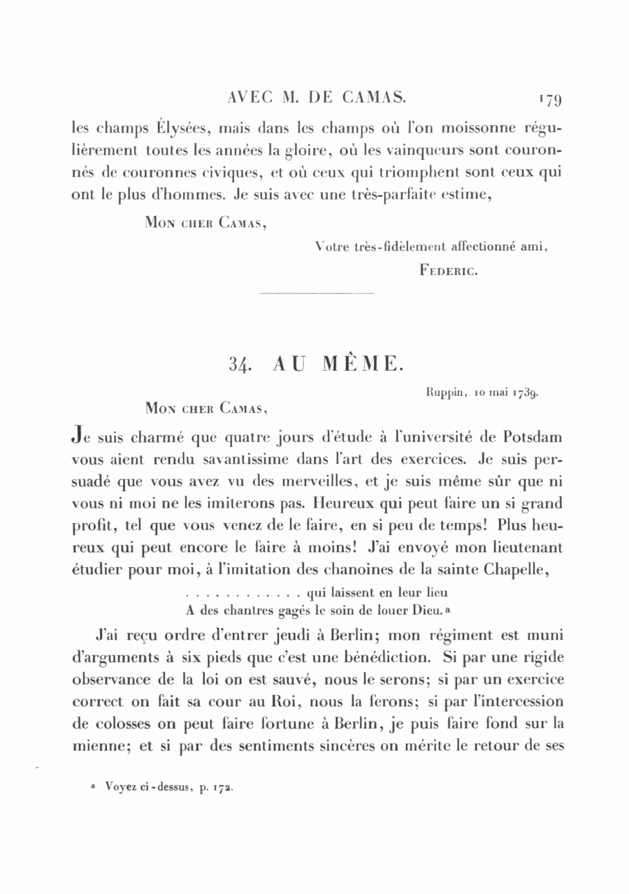 Je suis charmé que quatre jours d'étude à l'université de Potsdam vous aient rendu savantissime dans l'art des exercices. Je suis persuadé que vous avez vu des merveilles, et je suis même sûr que ni vous ni moi ne les imiterons pas. Heureux qui peut faire un si grand profit, tel que vous venez de le faire, en si peu de temps! Plus heureux qui peut encore le faire à moins! J'ai envoyé mon lieutenant étudier pour moi, à l'imitation des chanoines de la sainte Chapelle,