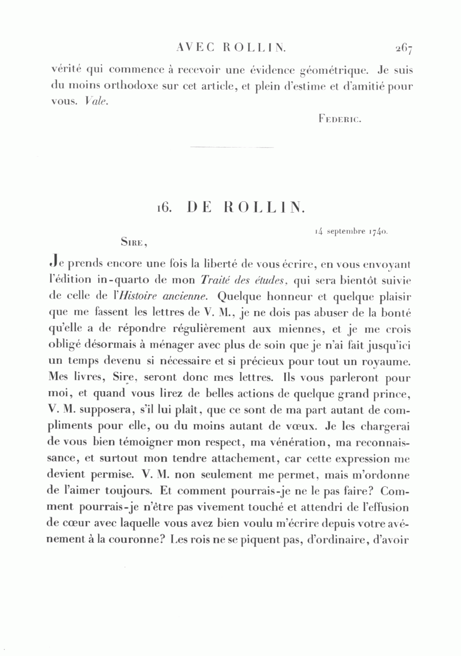 Je prends encore une fois la liberté de vous écrire, en vous envoyant l'édition in-quarto de mon Traité des études, qui sera bientôt suivie de celle de l'Histoire ancienne. Quelque honneur et quelque plaisir que me fassent les lettres de V. M., je ne dois pas abuser de la bonté qu'elle a de répondre régulièrement aux miennes, et je me crois obligé désormais à ménager avec plus de soin que je n'ai fait jusqu'ici un temps devenu si nécessaire et si précieux pour tout un royaume. Mes livres, Sire, seront donc mes lettres. Ils vous parleront pour moi, et quand vous lirez de belles actions de quelque grand prince, V. M. supposera, s'il lui plaît, que ce sont de ma part autant de compliments pour elle, ou du moins autant de vœux. Je les chargerai de vous bien témoigner mon respect, ma vénération, ma reconnaissance, et surtout mon tendre attachement, car cette expression me devient permise. V. M. non seulement me permet, mais m'ordonne de l'aimer toujours. Et comment pourrais-je ne le pas faire? Comment pourrais-je n'être pas vivement touché et attendri de l'effusion de cœur avec laquelle vous avez bien voulu m'écrire depuis votre avénement à la couronne? Les rois ne se piquent pas, d'ordinaire, d'avoir