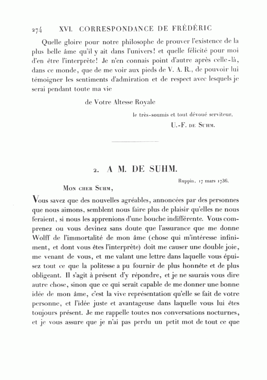 <274>Quelle gloire pour notre philosophe de prouver l'existence de la plus belle âme qu'il y ait dans l'univers! et quelle félicité pour moi d'en être l'interprète! Je n'en connais point d'autre après celle-là, dans ce inonde, que de me voir aux pieds de V. A. R., de pouvoir lui témoigner les sentiments d'admiration et de respect avec lesquels je serai pendant toute ma vie