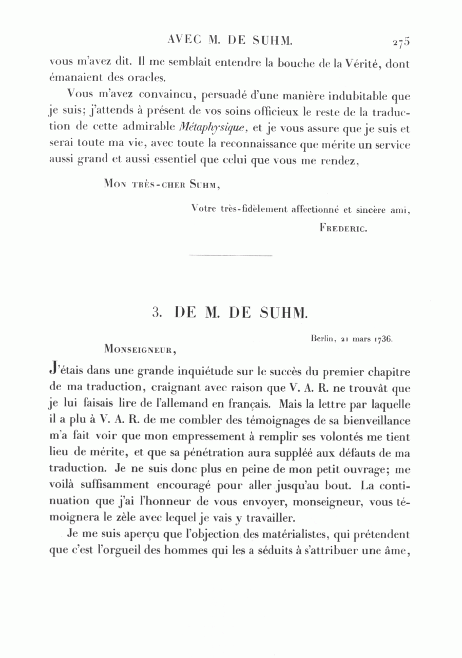 Vous m'avez convaincu, persuadé d'une manière indubitable que je suis; j'attends à présent de vos soins officieux le reste de la traduction de cette admirable Métaphysique, et je vous assure que je suis et serai toute ma vie, avec toute la reconnaissance que mérite un service aussi grand et aussi essentiel que celui que vous me rendez,